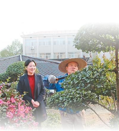 顾书勤(左)与工人沟通社区绿化维护事宜。