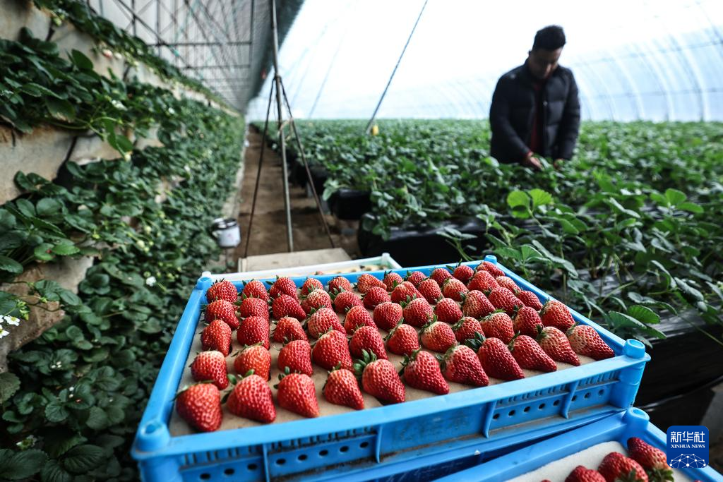 1月12日,在辽宁东港一个草莓大棚内,种植户在采摘草莓。新华社记者 潘昱龙 摄