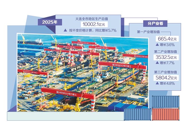 日前,辽宁省大连市政府新闻办公室举行新闻发布会,发布了2025年全市经济运行情况。根据辽宁省地区生产总值统一核算结果:2025年,大连全市地区生产总值10002.1亿元,按不变价格计算,同比增长5.7%。由此,大连成为东北首座GDP破万亿元城市。分产业看,第一产业增加值665.4亿元,增长3.6%;第二产业增加值3532.5亿元,增长7.7%;第三产业增加值5804.2亿元,增长4.8%。船舶制造等传统产业转型升级,半导体等新兴产业突破重围,文体旅商融合带动,成为大连地区生产总值突破万亿元的核心驱动力。同时,大连依然存在着发展中的瓶颈和不足,亟待进一步突破,更好地推动经济高质量发展。